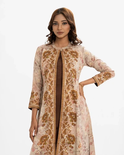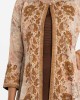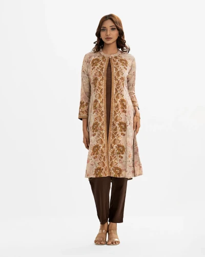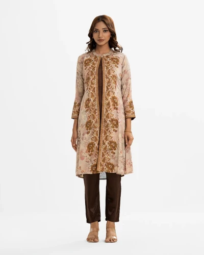 Women’s printed A-line shrug style salwar kameez in jacquard fabric. Stand collar, long-sleeved with a button fastaning shrug. Crepe sleeveless kameez and round neck with line stitching at the front. Complemented with a crepe pant.