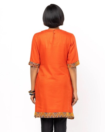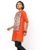 Orange printed dobby textured viscose top with multicolour embroidery over white panel.